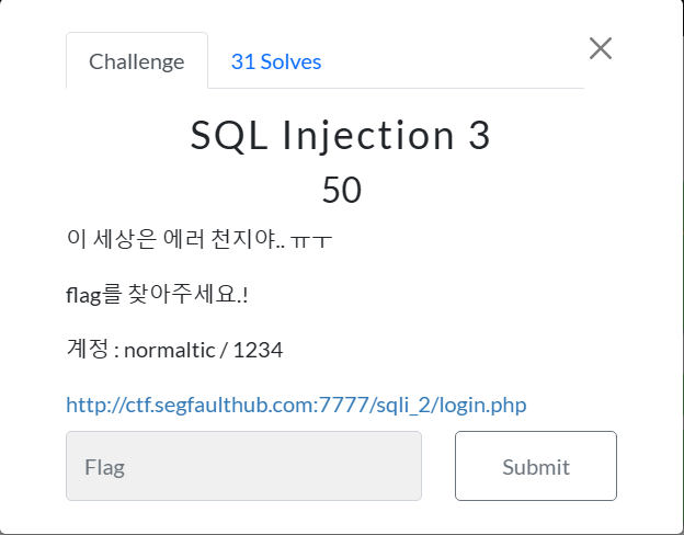 | Segfault CTF - (7주 차) SQL Injection 5 (0) | 2024.06.05 |